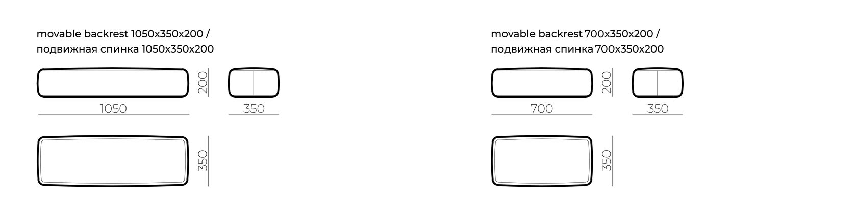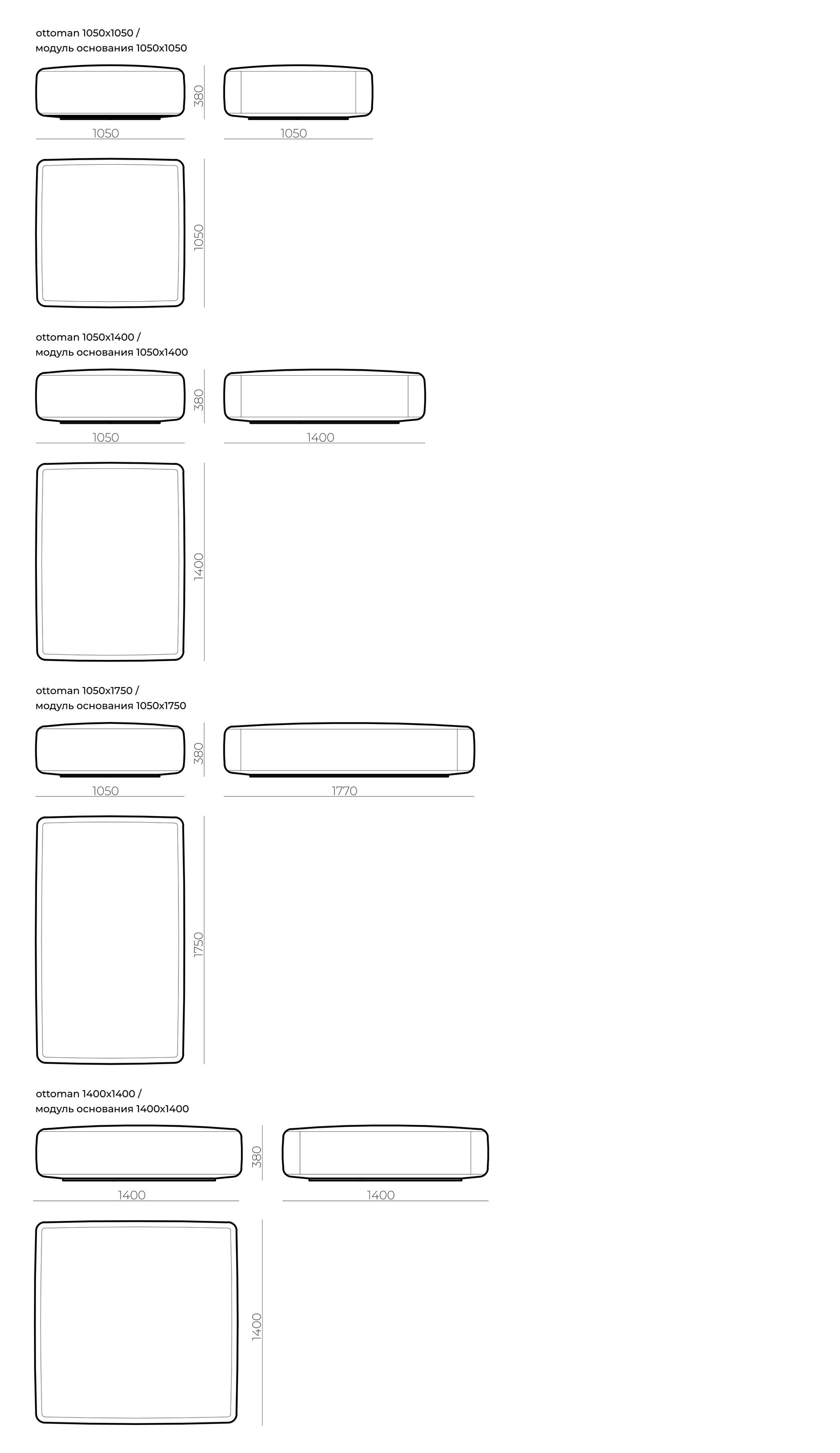Доступные размеры: Блоки оснований дивана: 1050x1050, 1050x1400, 1050x1750, 1400x1400 mm Высота посадки: 380mm Блоки спинки дивана: 700х350х200, 1050х350х200 mm