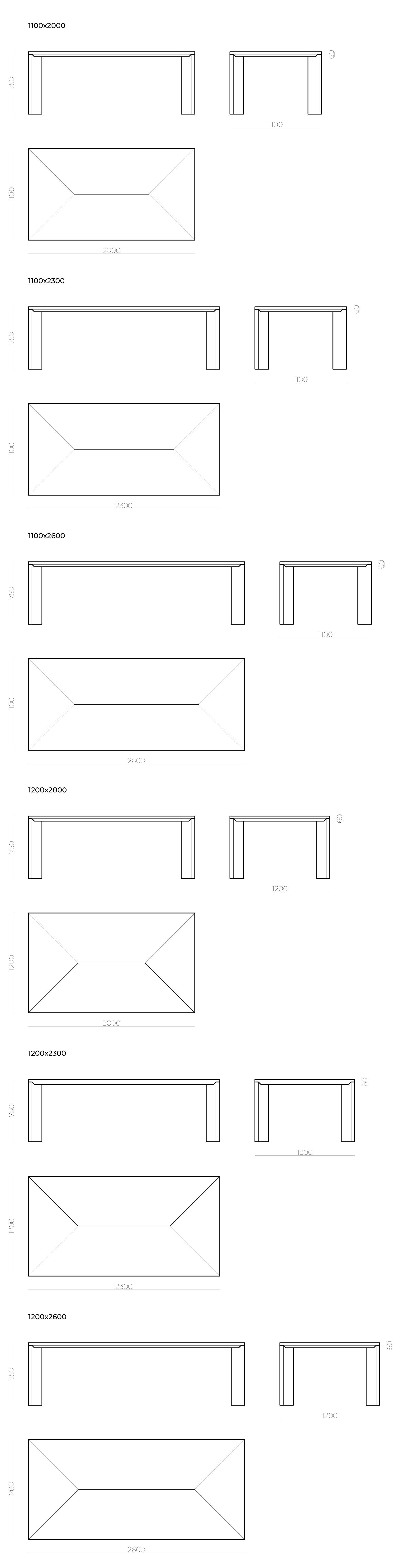 Габаритные размеры: 2000х1100х750mm; 2300х1100х750mm; 2600х1100х750mm; 2000х1200х750mm; 2300х1200х750mm; 2600х1200х750mm