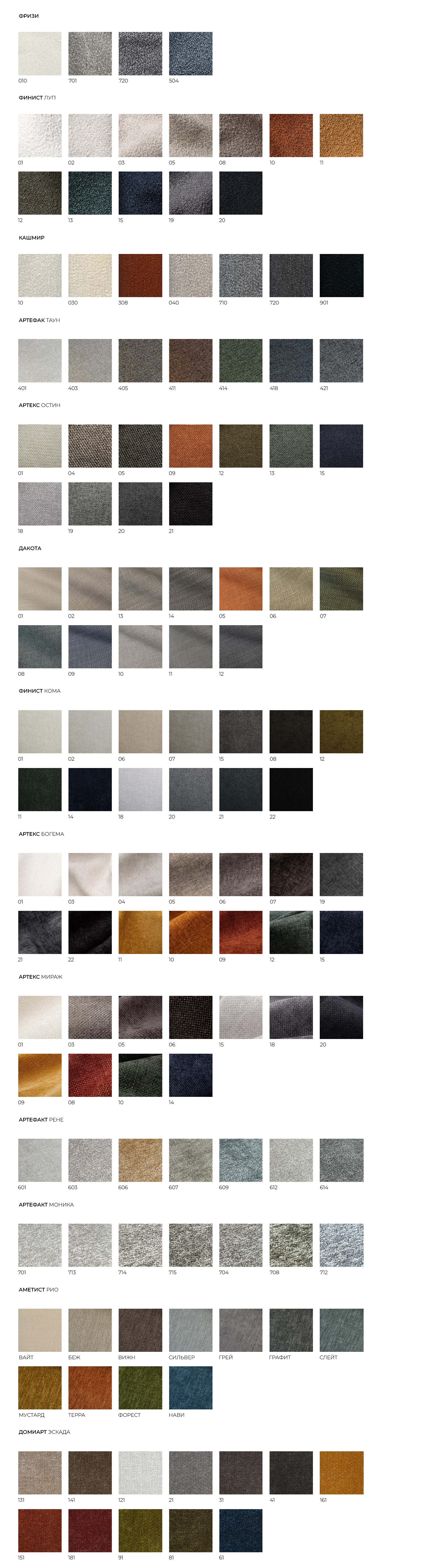 Мебель может быть выполнена в любой из этих тканей, кожи и тонировке древесины. За образцами тканей обратитесь к менеджеру.