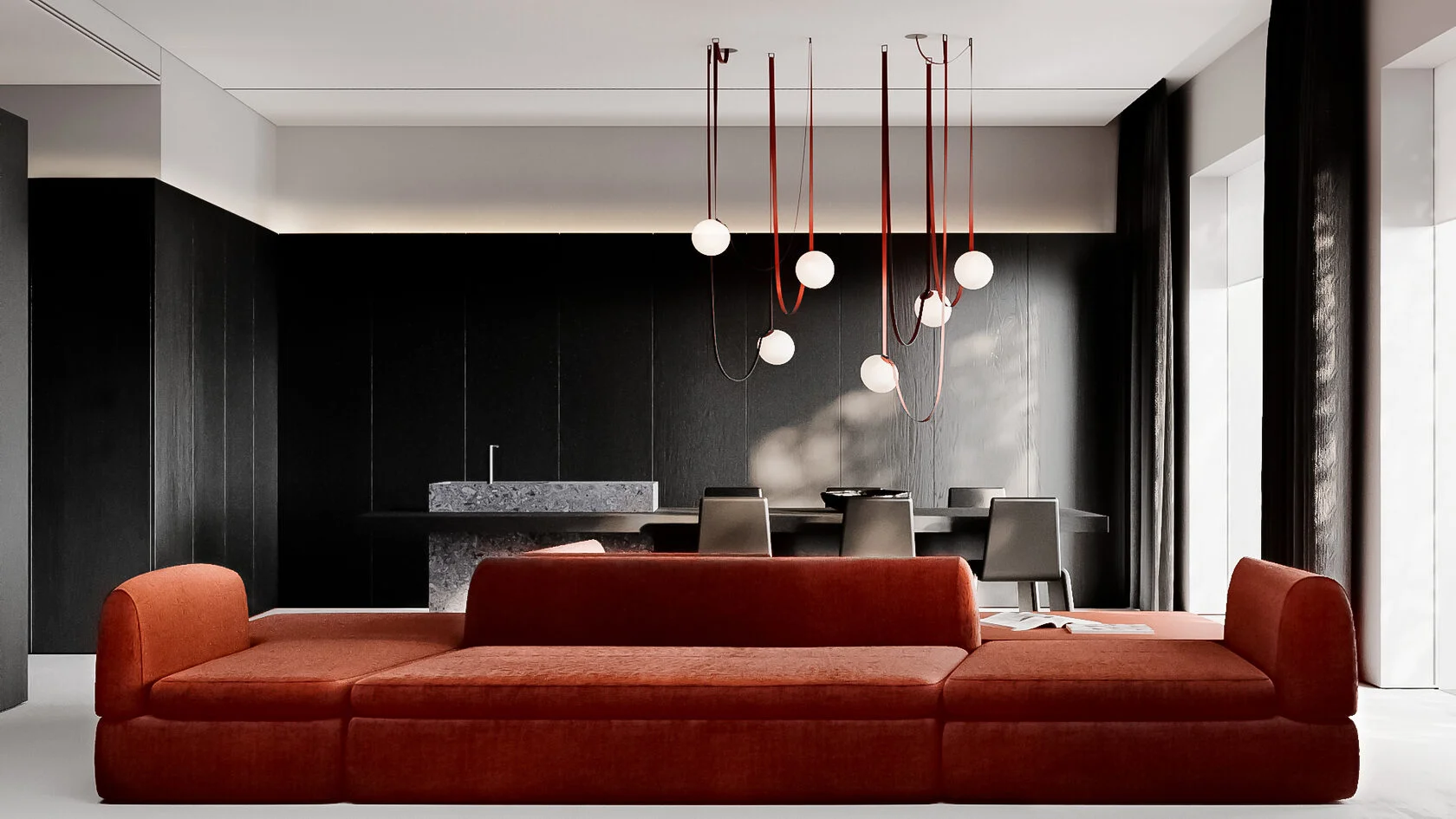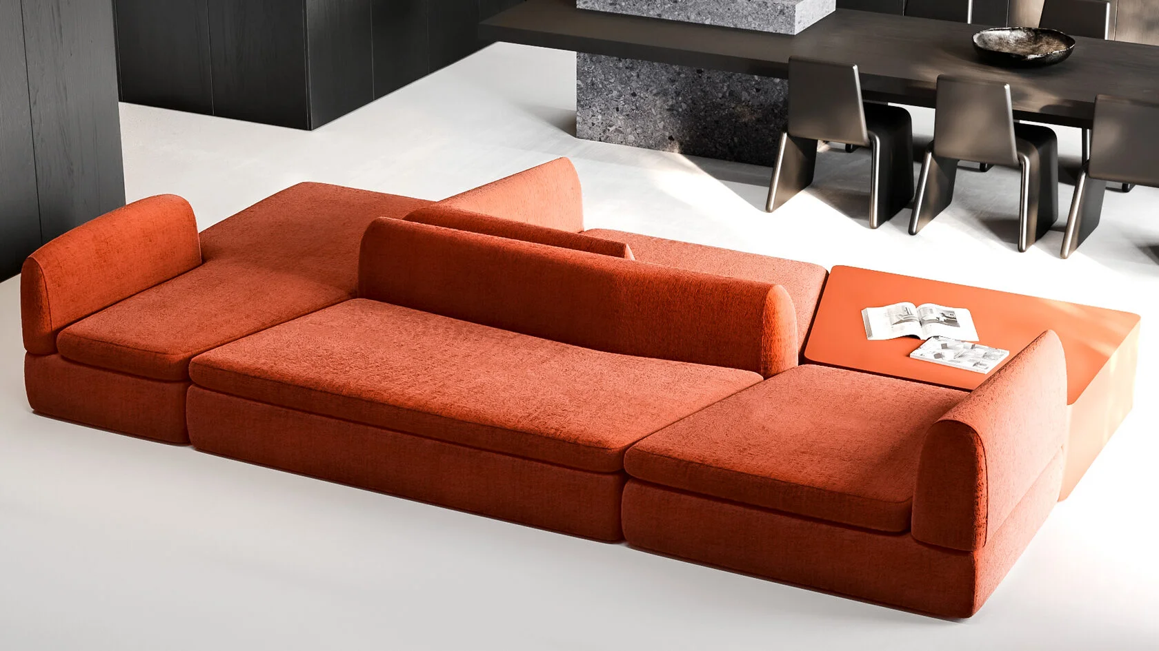 Один диван PUZZLE, трансформируясь, становится полноценной гостиной зоной с разными