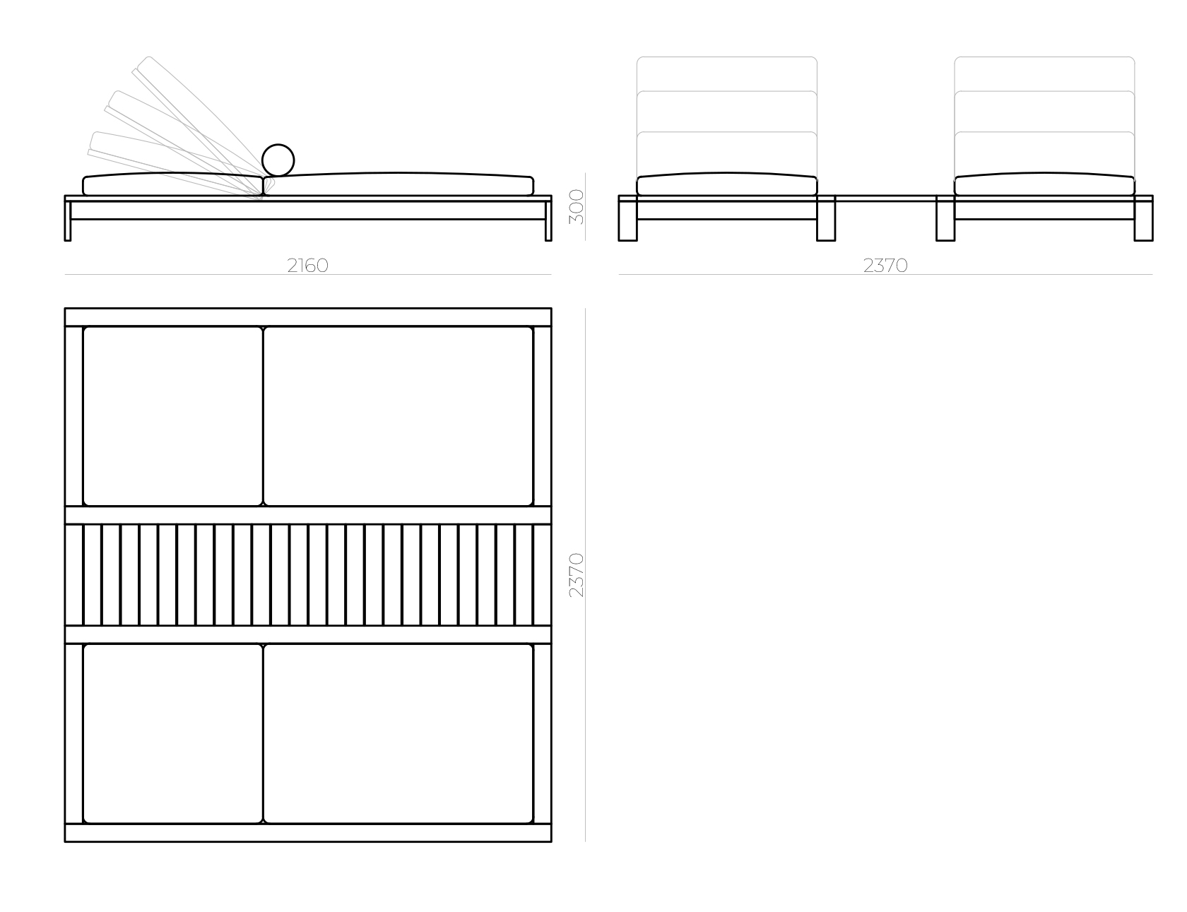 Сдвоенный шезлонг, в котором принцип единства формы и функции расширен до уровня совместного пространства. Это не просто два лежака рядом — это единая композиция, объединённая общим основанием и интегрированным центральным столиком, создающим баланс между индивидуальностью и взаимодействием.