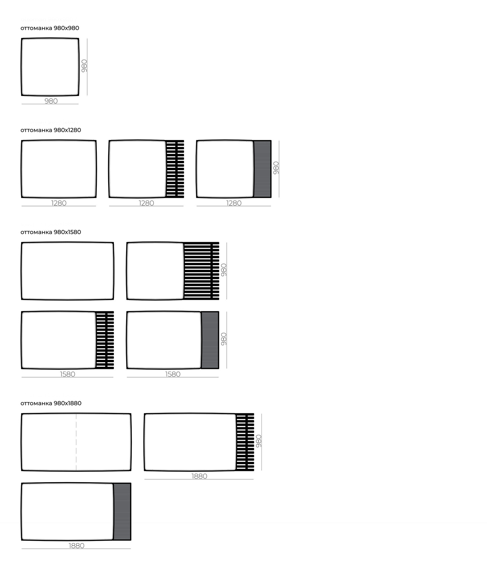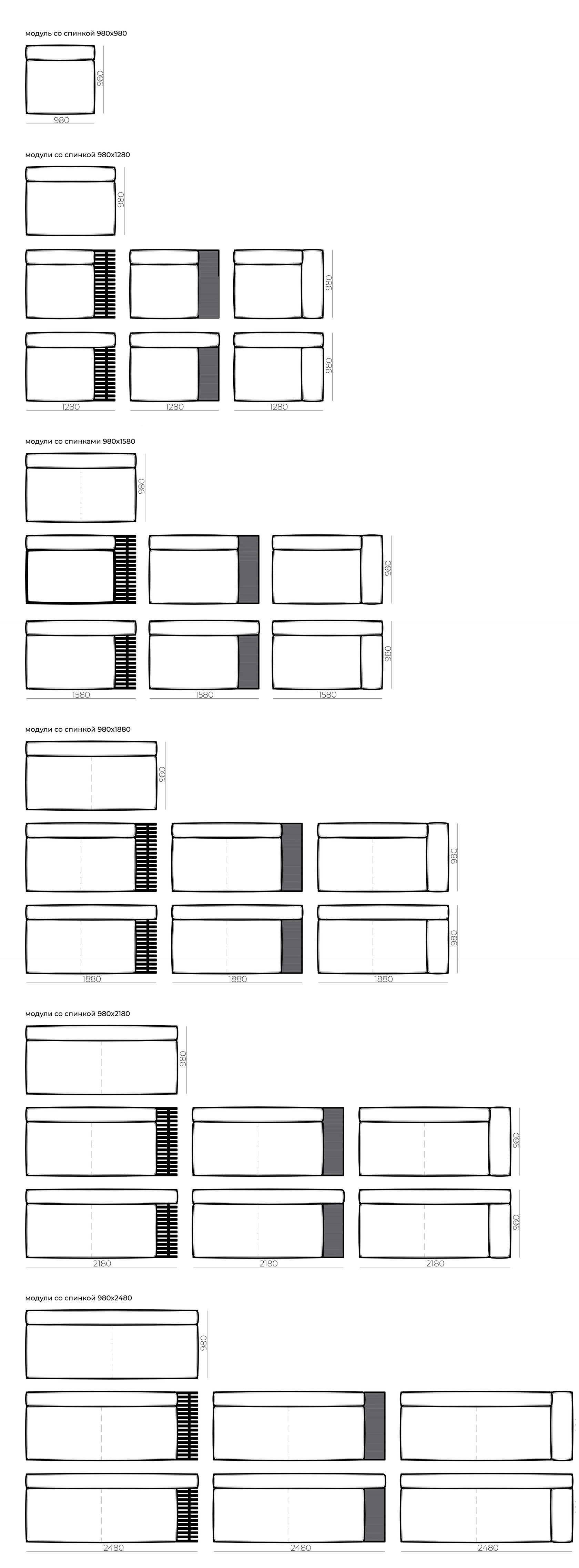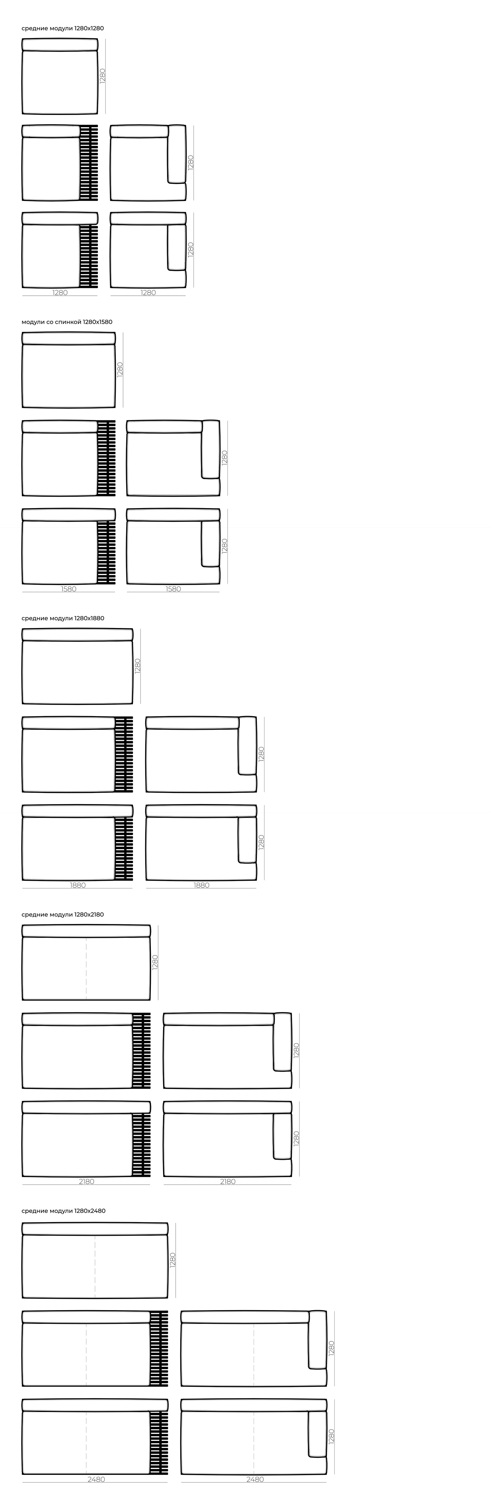 Доступные размеры: Блоки оснований дивана: 1280x980, 1280x1280, 1580x980, 1580x1280, 1580x1580, 1880x980, 1880x1280, 2180x980, 2180x1280 mm Высота посадки: 380 mm Габаритная высота: 600 mm