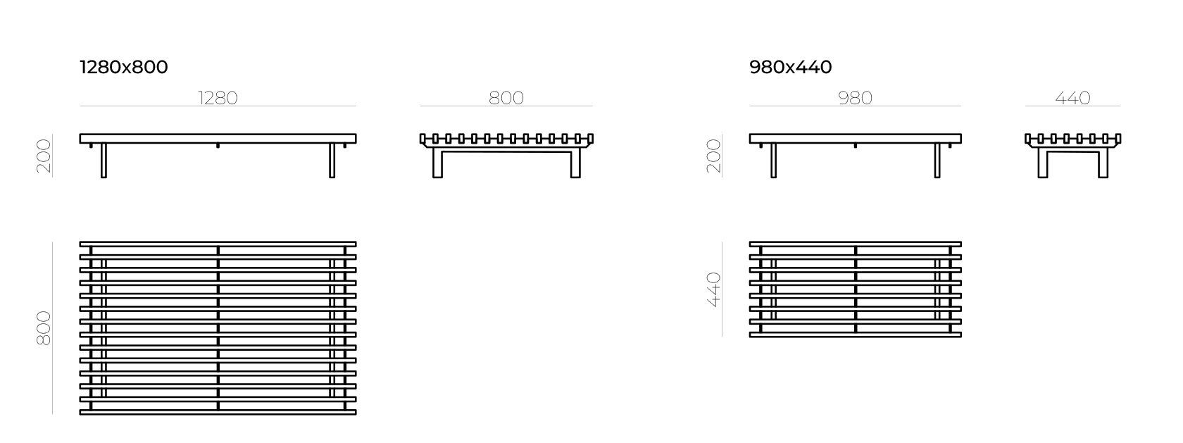 Габаритные размеры: 1280х800mm; 980х440mm; Высота металлического основания: 200mm