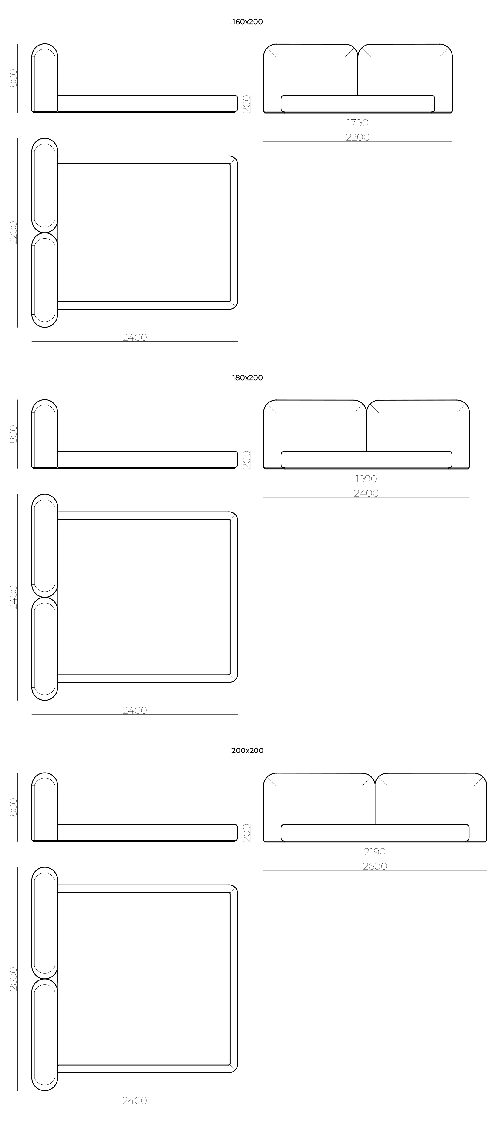 Габариты кровати: 2200x2400х800, 2400x2400х800, 2600x2400х800 mm