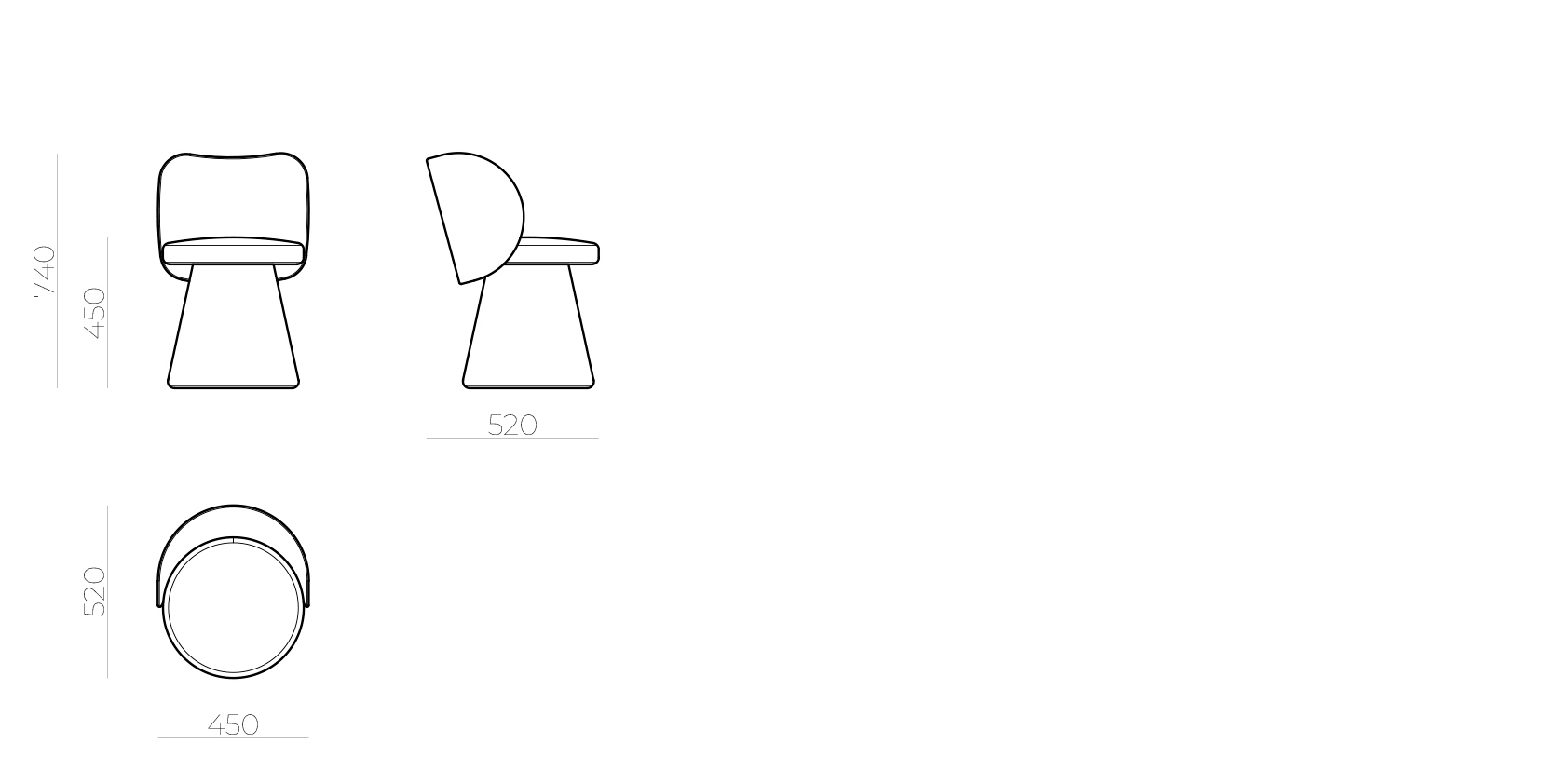 Невероятно простой и лаконичный стул, все линии которого подчинены радиальной системе. Сидение может быть установлено на поворотный или поворотно-возвратный механизм выдерживающий 200кг.