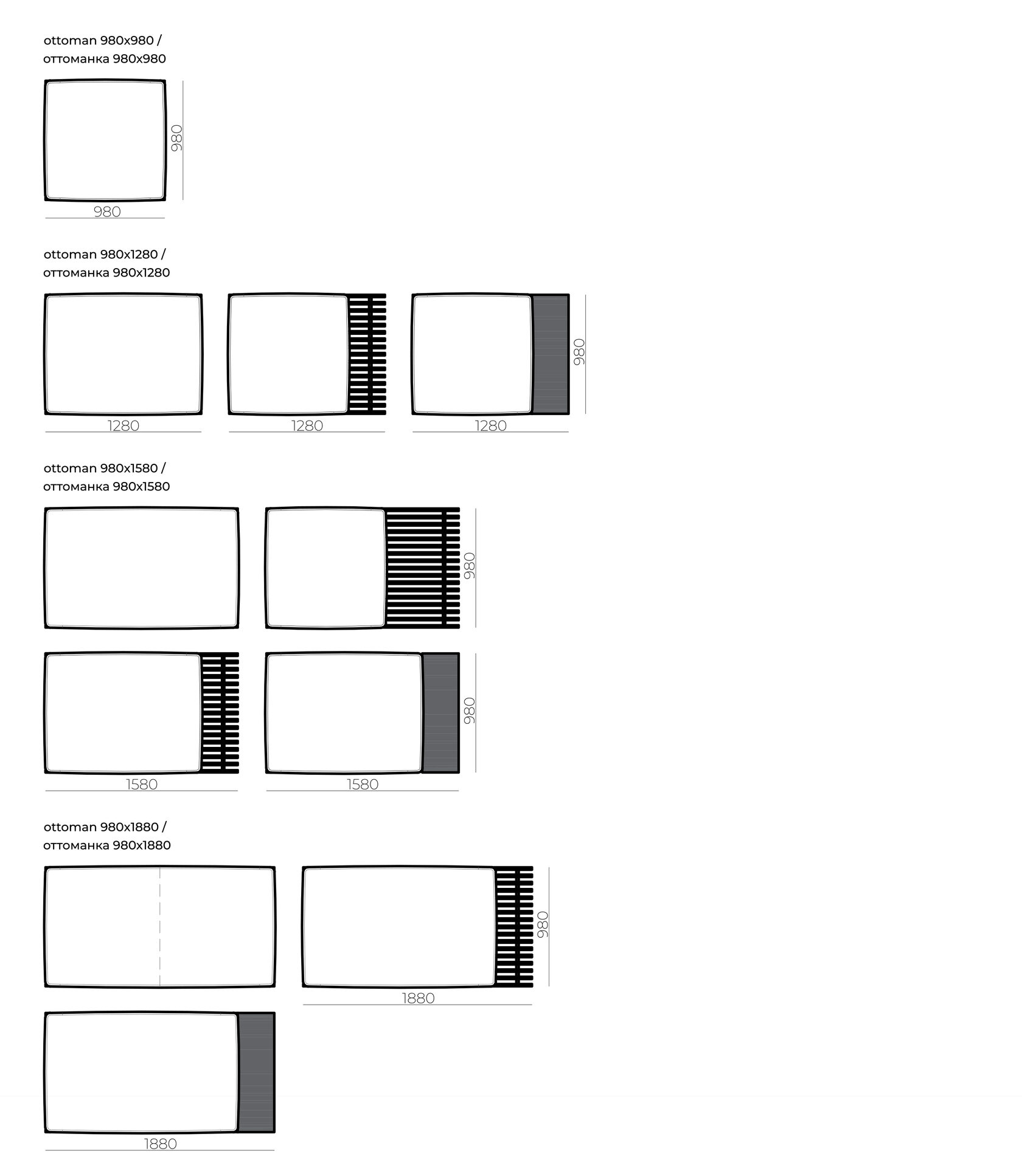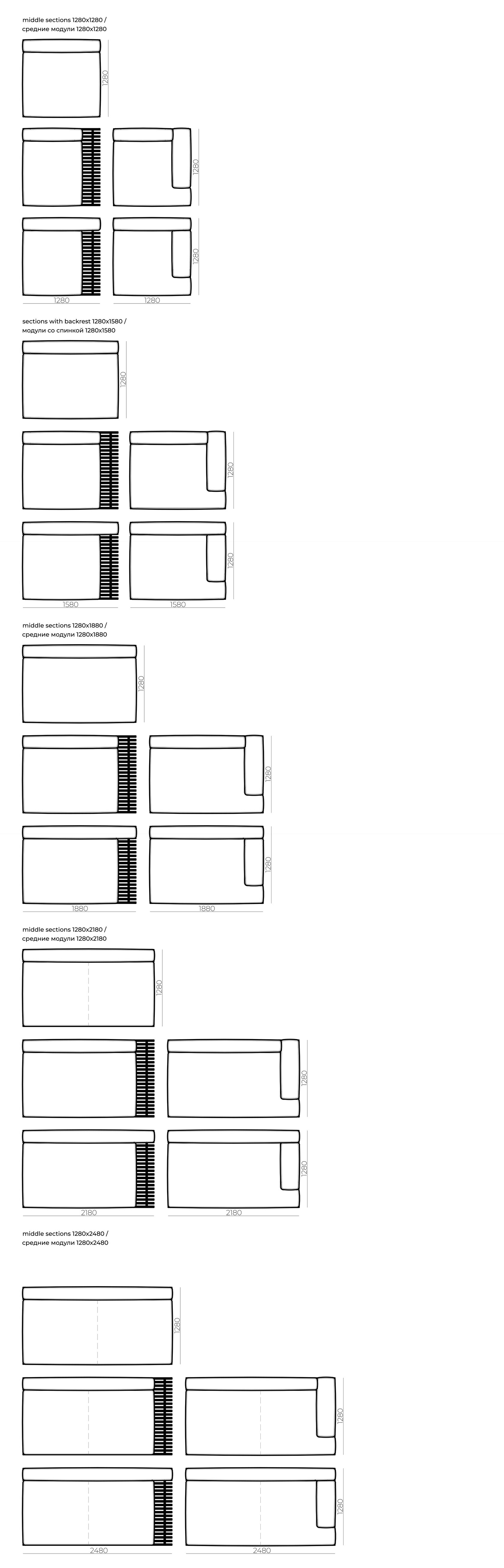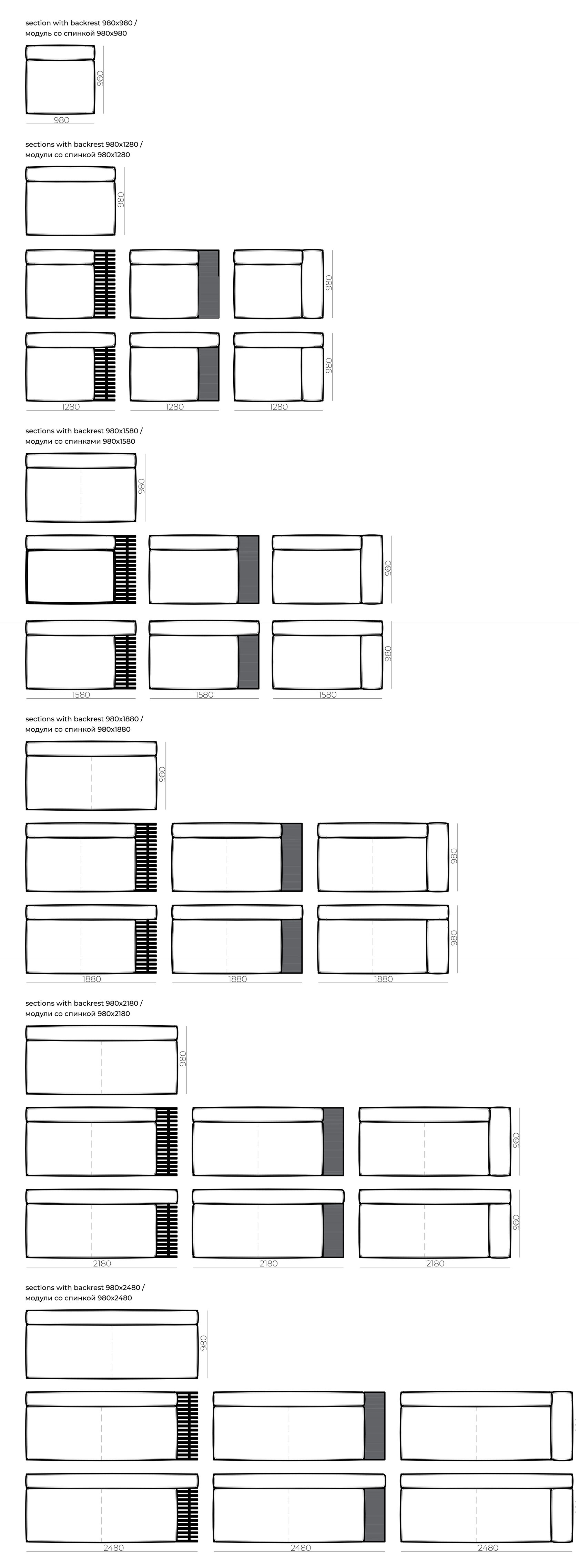 Доступные размеры: Блоки оснований дивана: 1280x980, 1280x1280, 1580x980, 1580x1280, 1580x1580, 1880x980, 1880x1280, 2180x980, 2180x1280, 2480x980, 2480x1280 mm Высота посадки: 380 mm Габаритная высота: 600 mm