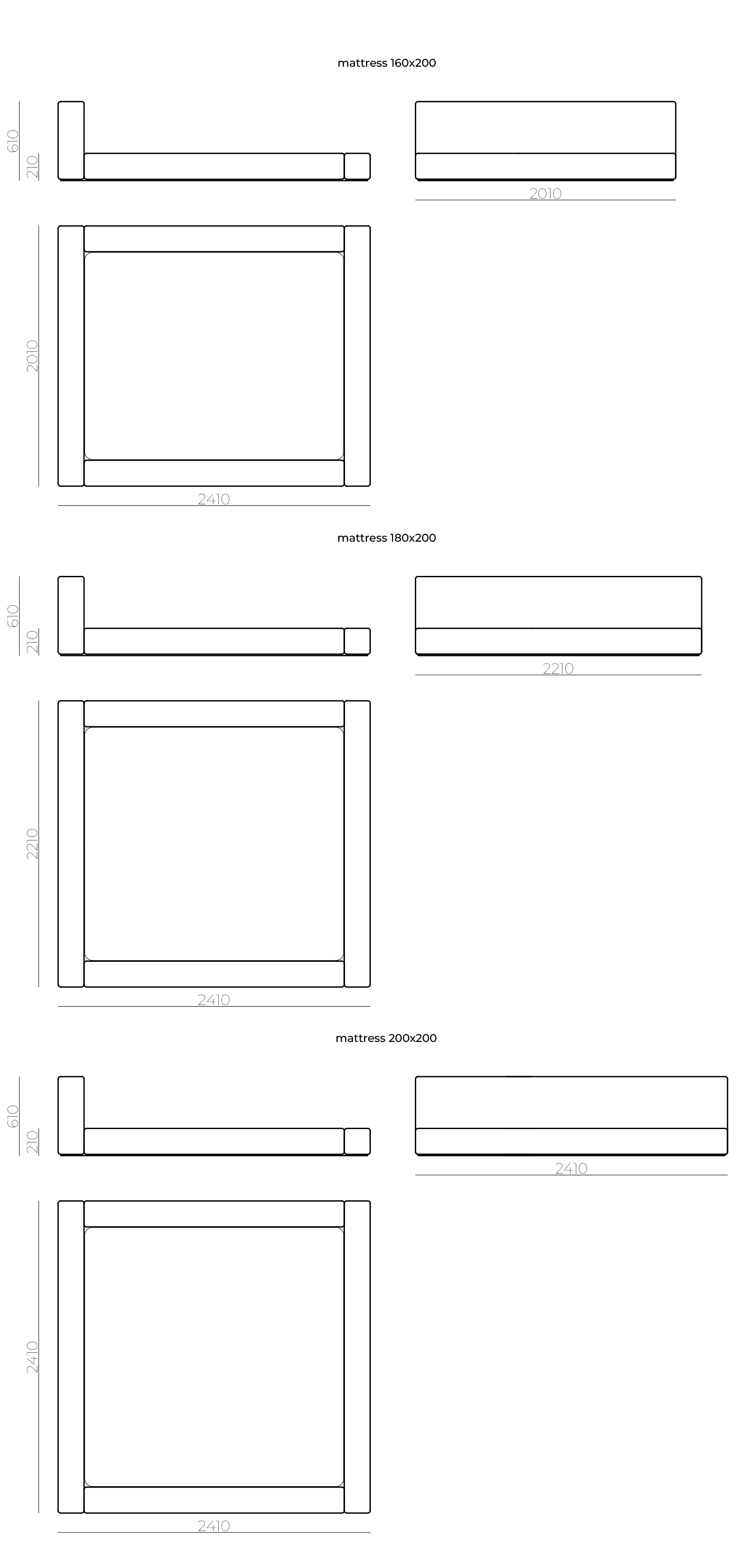 Габариты кровати: 2010x2410х610, 2210x2410х610, 2410x2410х610 mm